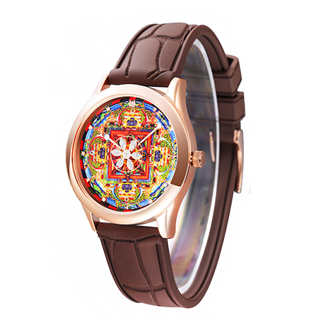 六字真言佛教手表由轉經輪演化而來,將六字大明咒嵌于秒盤,弘揚中華佛文化,締造手工藝術腕有,經過了眾多高僧大德的指點加持,六瓣蓮花上的吉祥咒語在壇城上右旋,時刻念經加持,消除業障,隨時積累功德與福報,佛說:若將此真言著于身、觸于手,或藏于家,皆可逢兇化吉、遇難呈祥。如佩戴六字真言佛教手表者,咒轉轉動,既有佛咒轉經功德的磁場加持,增長福報,一日轉動14400次,等同念咒14400遍,保佑大家平安吉祥,積累轉經輪的功德與意義,傳遞佛菩薩之間最美妙的溝通。