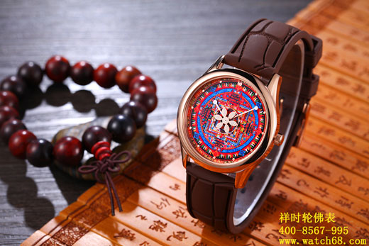 如意輪佛表由轉經輪演化而來,將六字大明咒嵌入秒盤中。六辯蓮花上的吉祥咒語在壇城上右旋,時刻念經加持,消除業障,隨時積累無上功德與福報。如配帶此佛表者,就能受常念六字大明咒的作用,咒輪轉動,即有佛咒轉經功德的磁場加持,增長福報,一日轉動14400次,等同念咒14400遍,保佑施主平安吉祥,積累轉經輪的功德與意義。