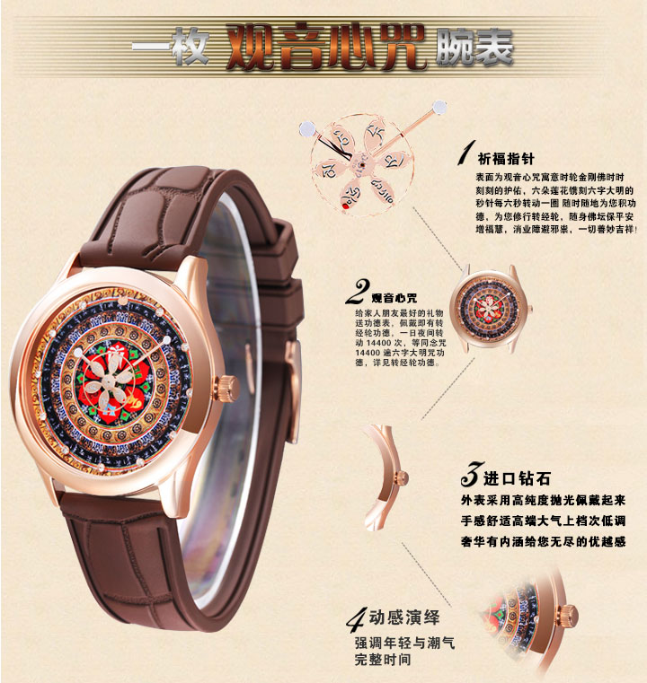 著于身、觸于手、藏于家可逢兇化吉,遇難呈祥;表芯無始無終轉動不息,威力無比;時光與佛法律動,分分秒秒佛佑相伴。一切所求,無不滿足。