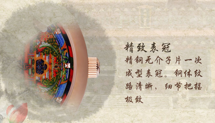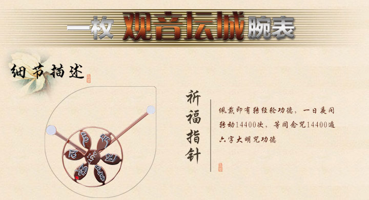 著于身、觸于手、藏于家可逢兇化吉,遇難呈祥;表芯無(wú)始無(wú)終轉(zhuǎn)動(dòng)不息,威力無(wú)比;時(shí)光與佛法律動(dòng),分分秒秒佛佑相伴。一切所求,無(wú)不滿足。